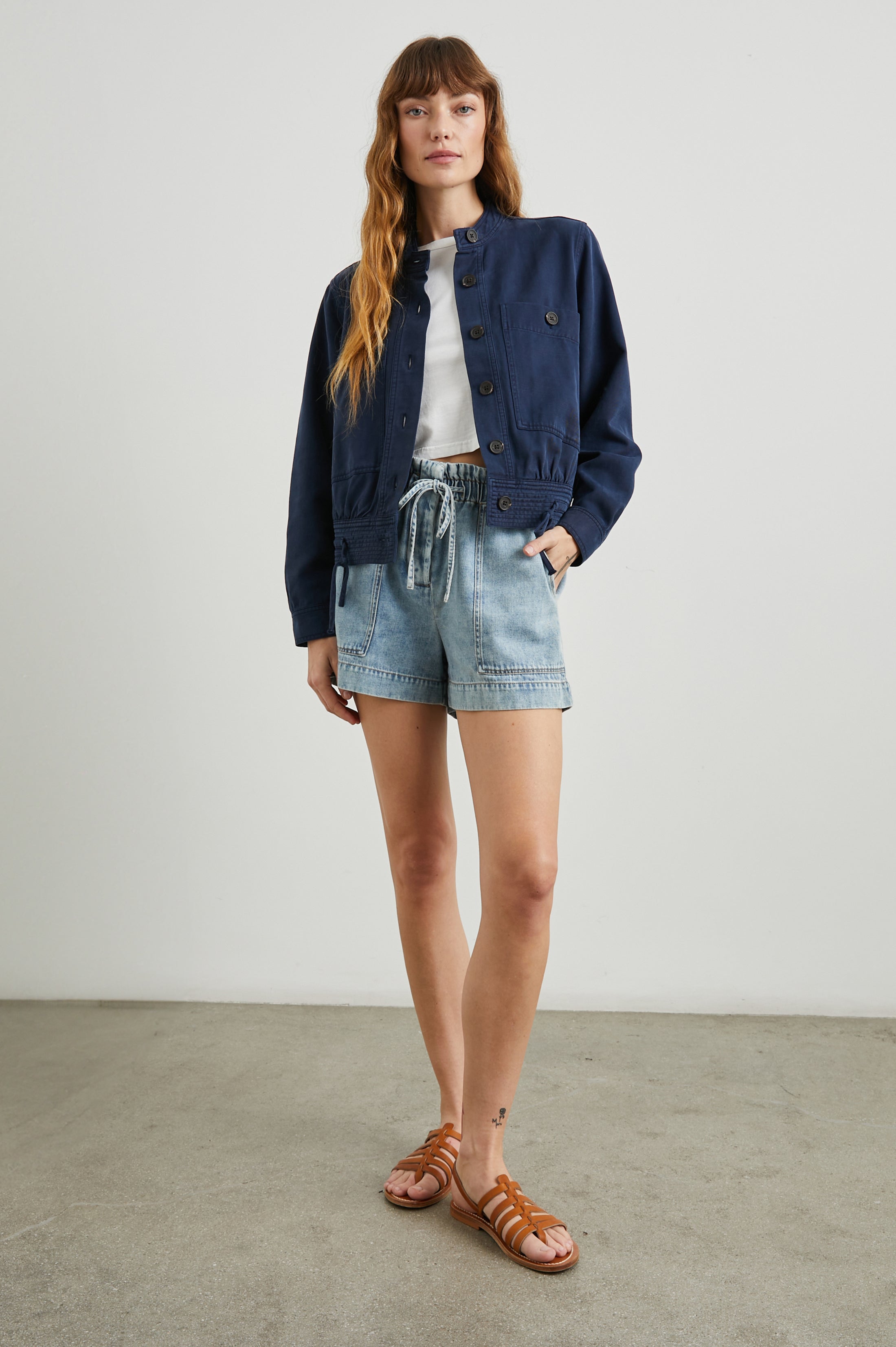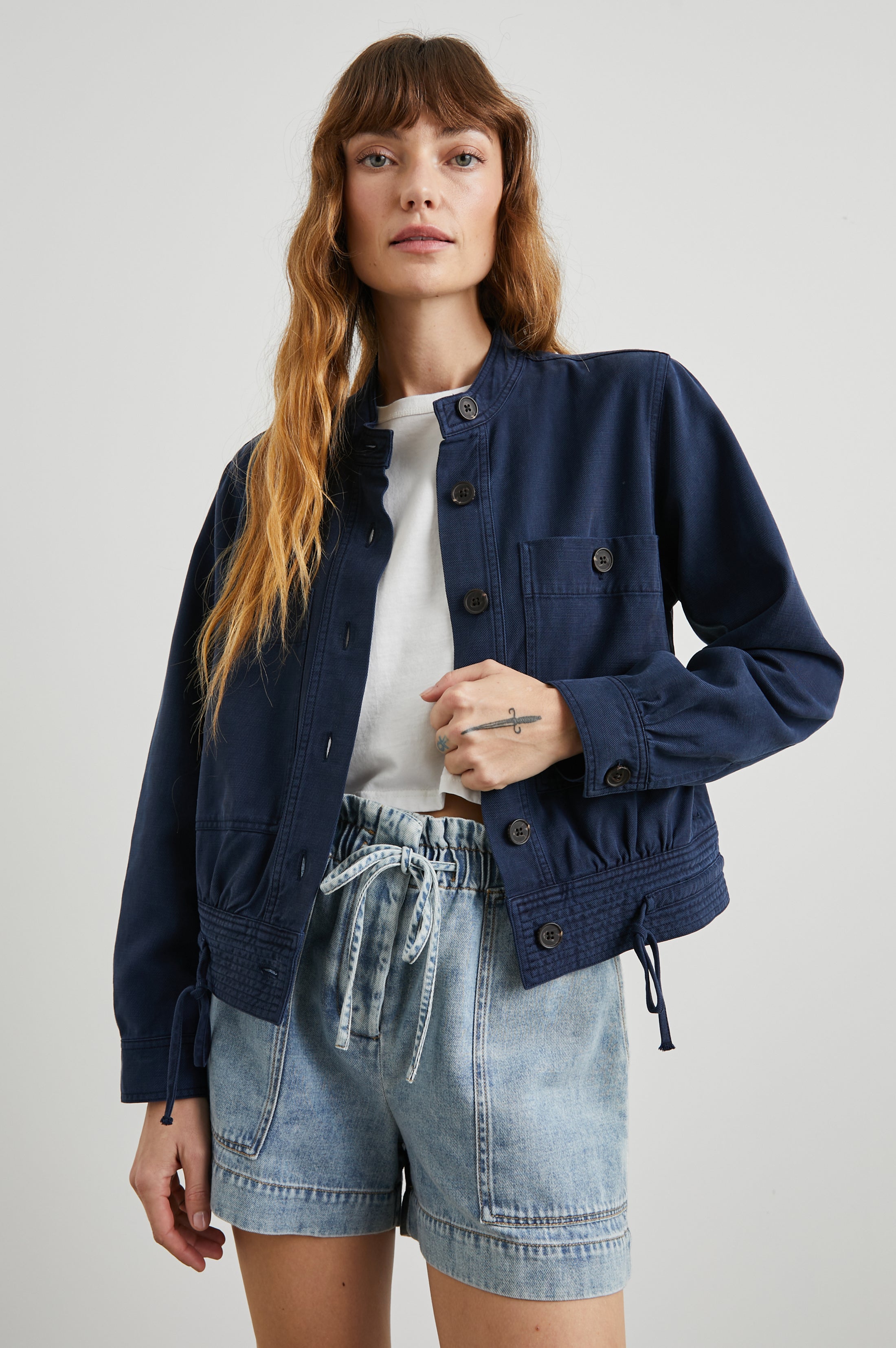 The Alma Jacket has two things you want in a top layer: a structured look and a soft, worn-in feel. The military-inspired jacket in navy comes with a mandarin collar, dark horn buttons, and oversized pockets. The trapunto hem has a tunnel drawcord that lets you cinch the waist or lay it loose.