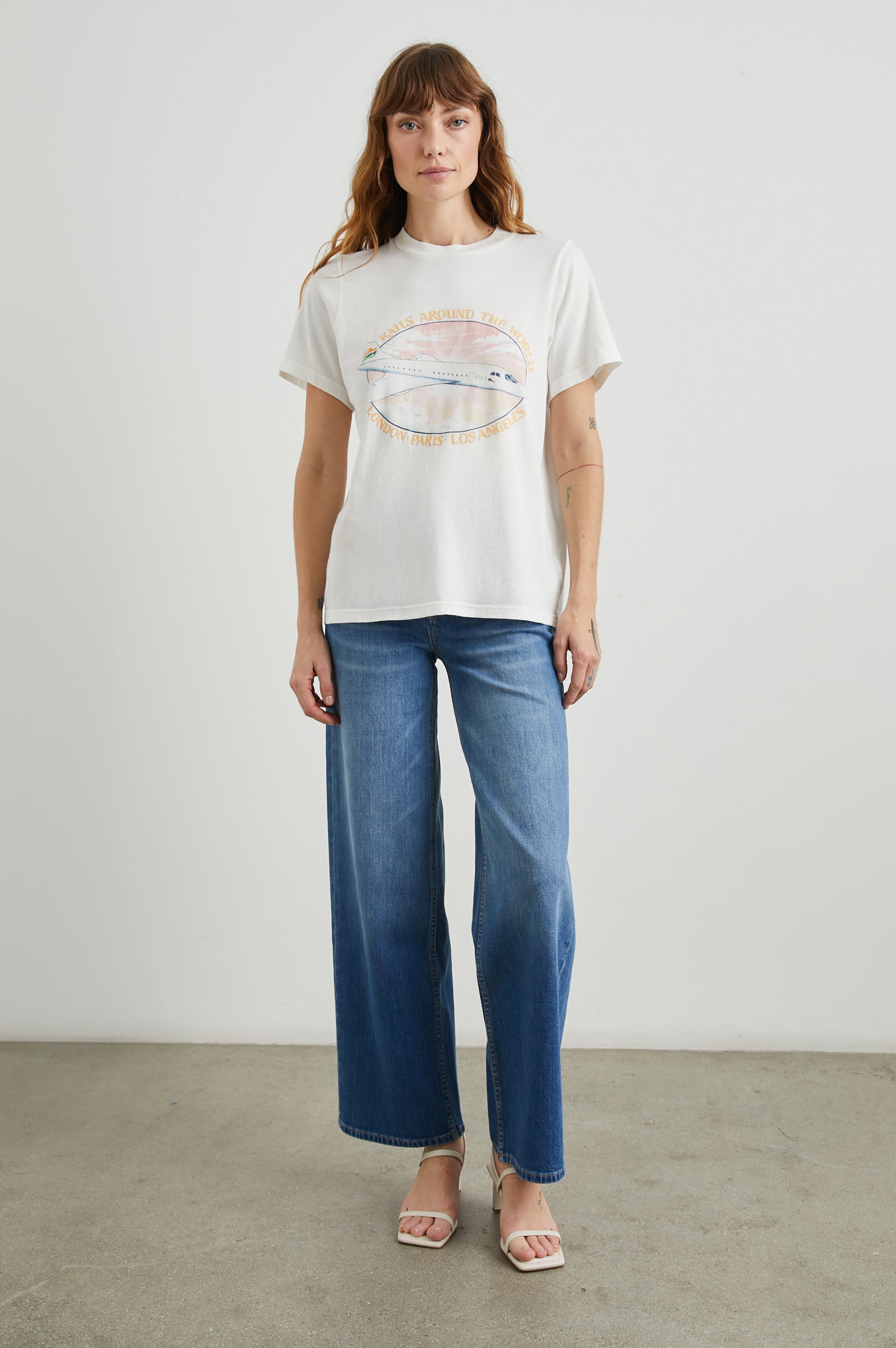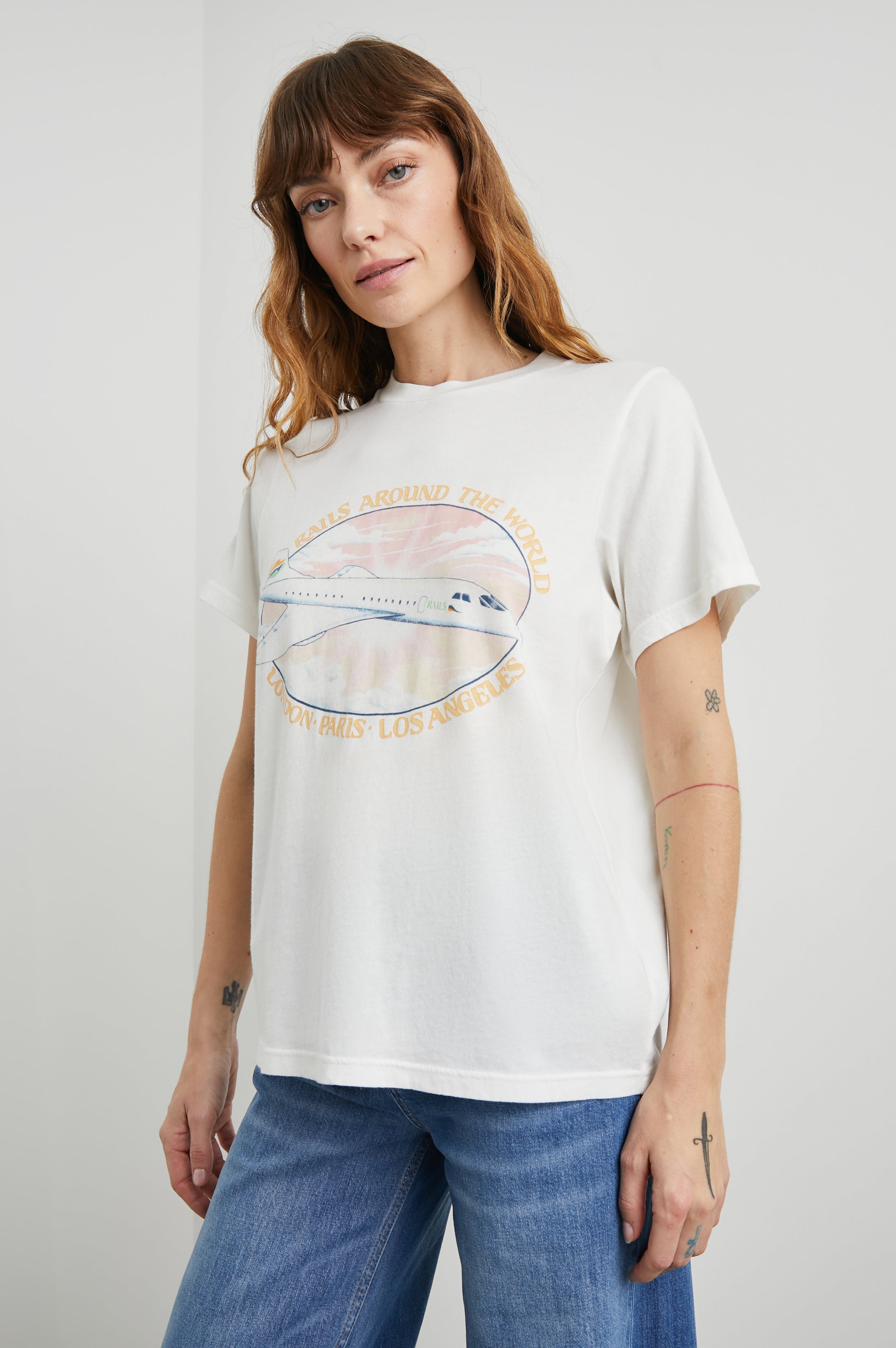 The graphic tee of your dreams. Made from an unbelievably comfortable cotton jersey, this boyfriend-style shirt comes in a white colorway with a Rails jet setting print.