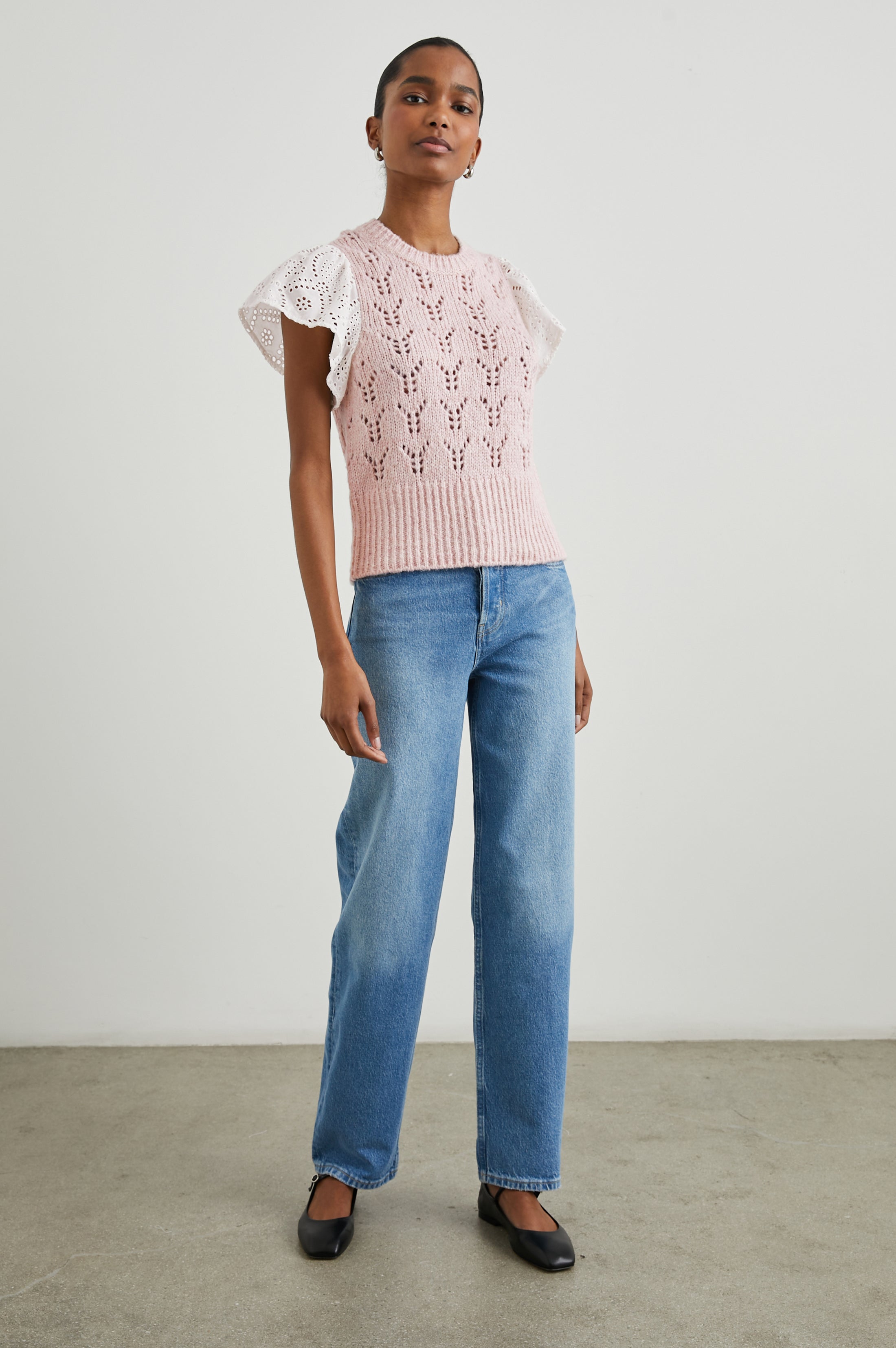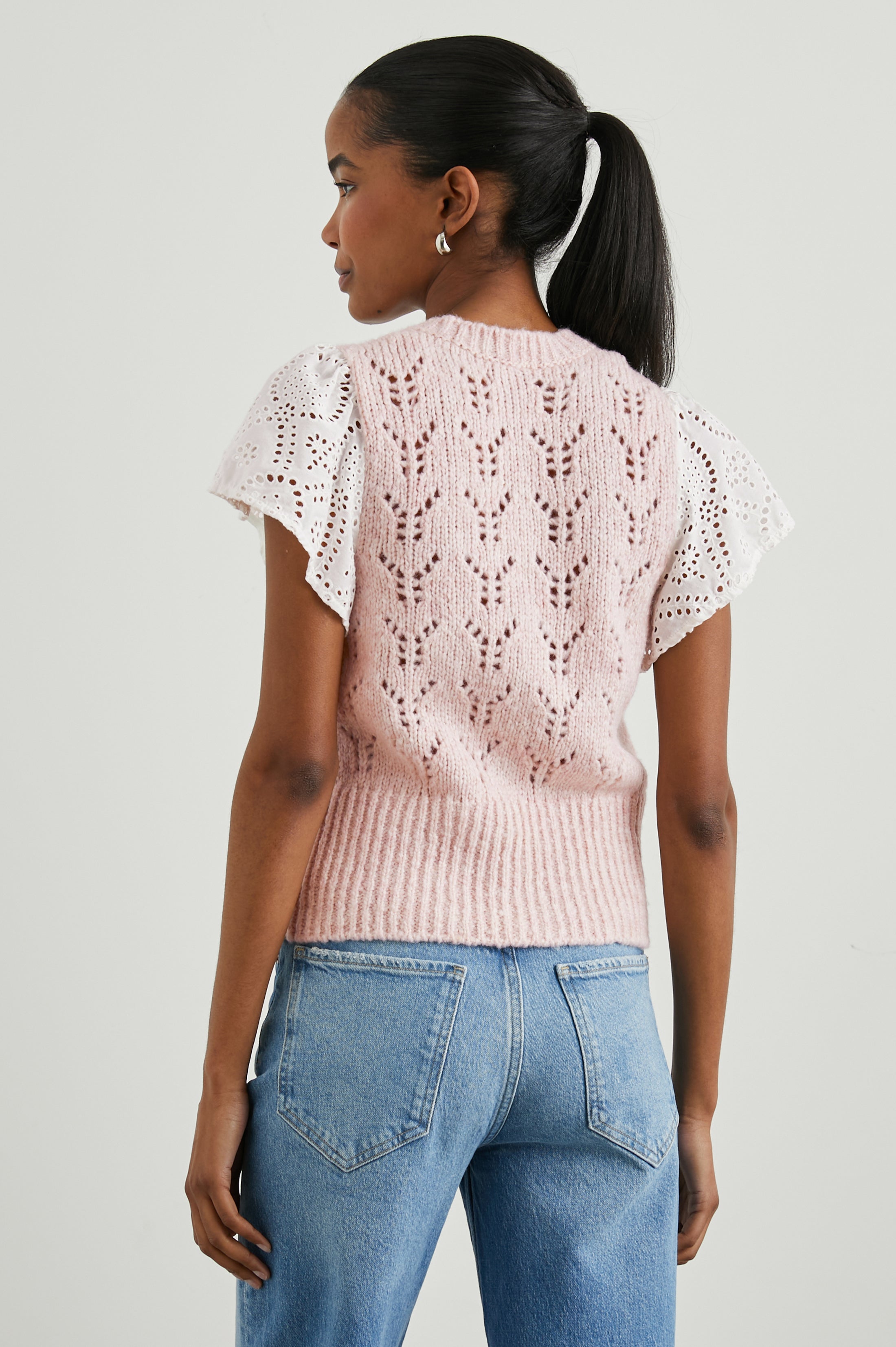 Sophisticated yet feminine, the Everly is comprised of a wool blend sweater vest and cotton poplin sleeves. This one-of-a-kind top gives the illusion of layers, instantly elevating any outfit.