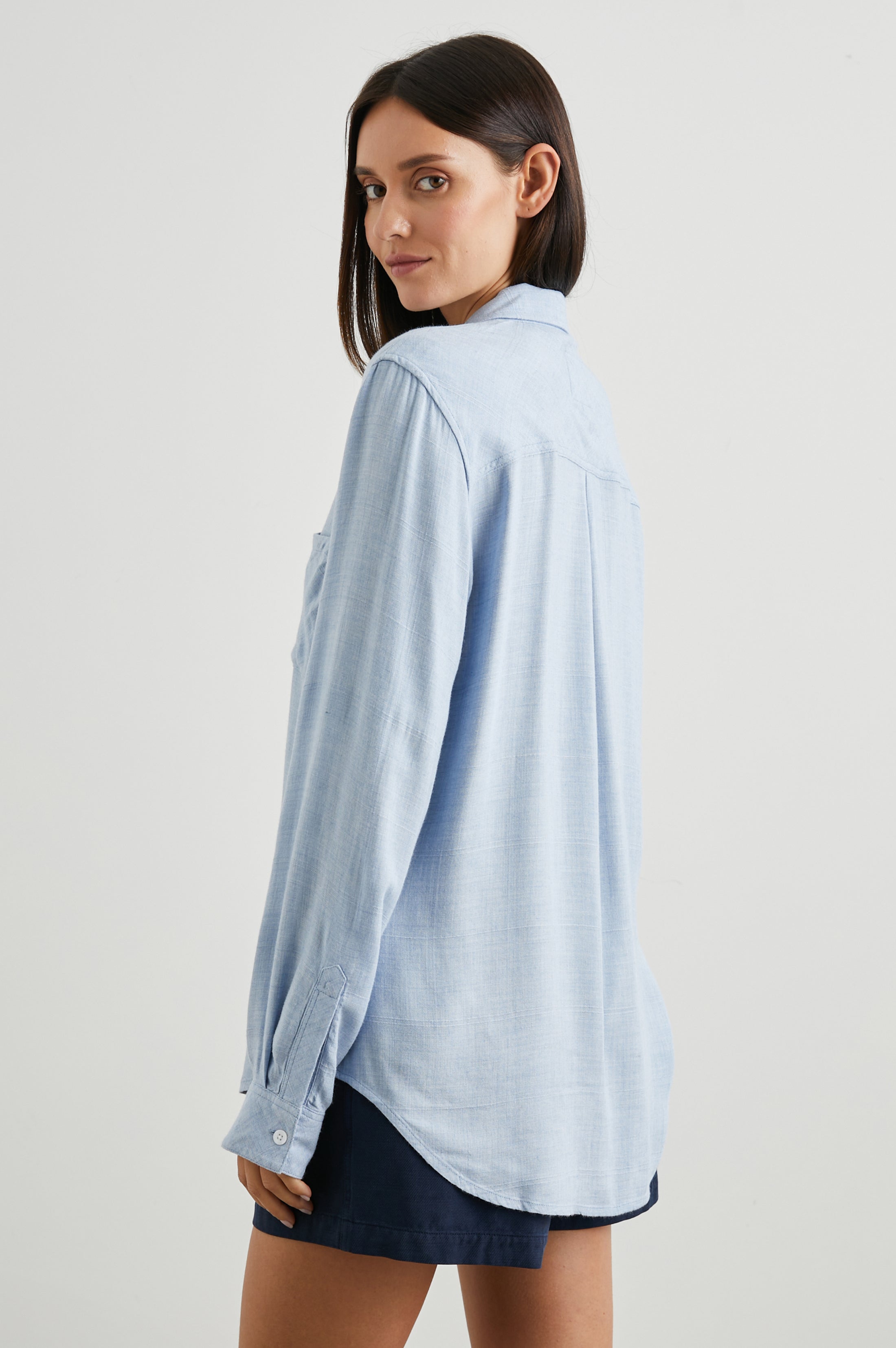 The Hunter Shirt is our signature button-down shirt that works for day, night, and even better, the weekend. Its unique fabric is spun from an incredibly soft rayon that hangs beautifully without any effort. This particular style features a light blue heather print. Perfectly relaxed with a classic fit, it can be tucked, tied, or left open.