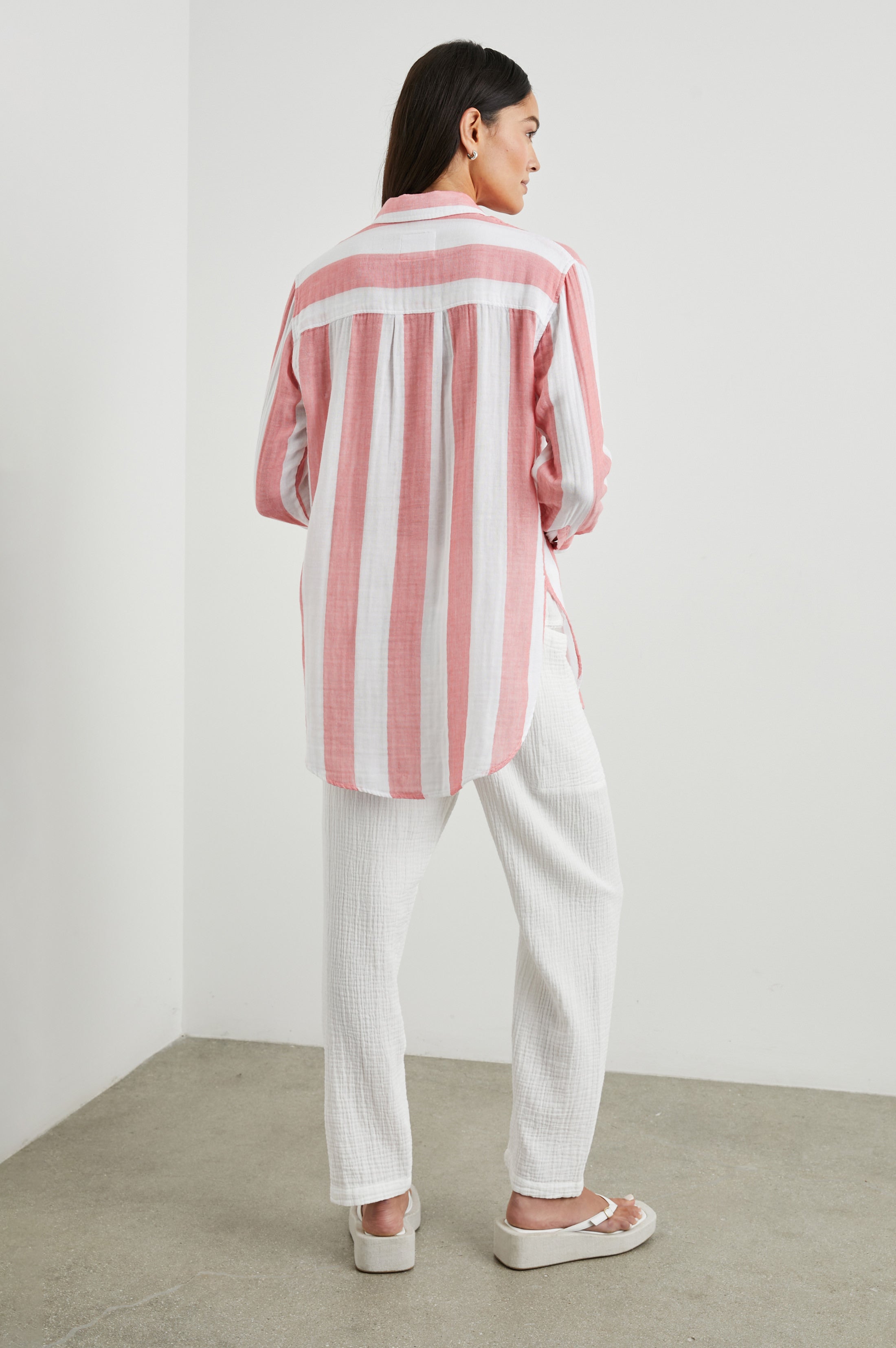 The Jaylin Top is a menswear-inspired shirt, oversized in blue and white stripes with a chest pocket and contrasting stripes at cuff and elongated hem. Wear with your favorite mini skirt, layered loosely over a tee and trousers, or as a breezy cover up on the beach.