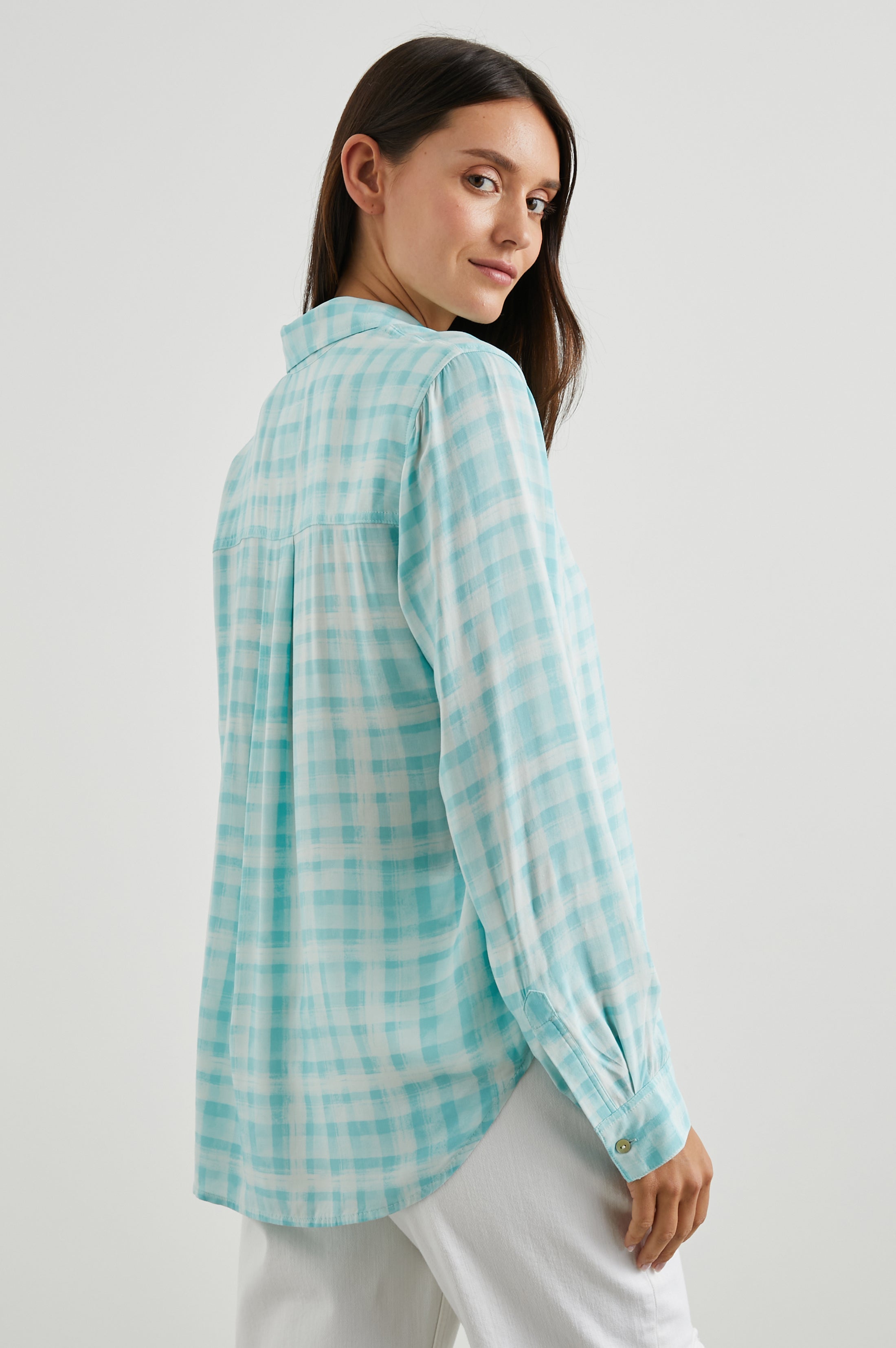 Elevated and easy to wear, the Josephine Shirt is a foundational piece for your wardrobe. The button-down has an plaid, teal and white print and is crafted with super soft, featherweight rayon. It's then finished with premium touches like a crisp collar, chest pocket, and natural shell buttons.