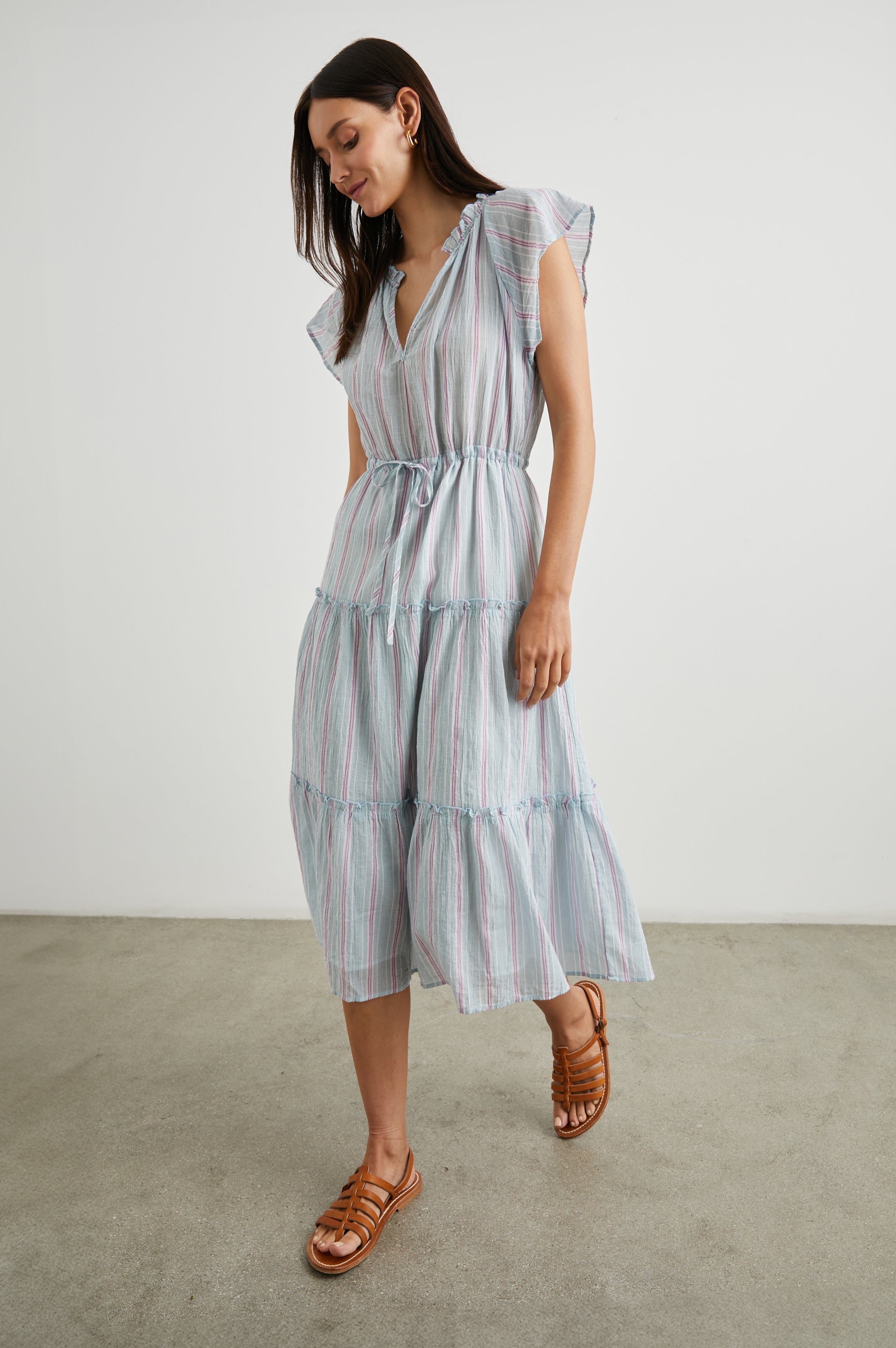 The Juni Dress is a breezy midi dress with a striped print that's sure to turn heads. With a chic v-neckline, flattering a-line silhouette, and horizontal pleating down the skirt, consider this style your new go-to.