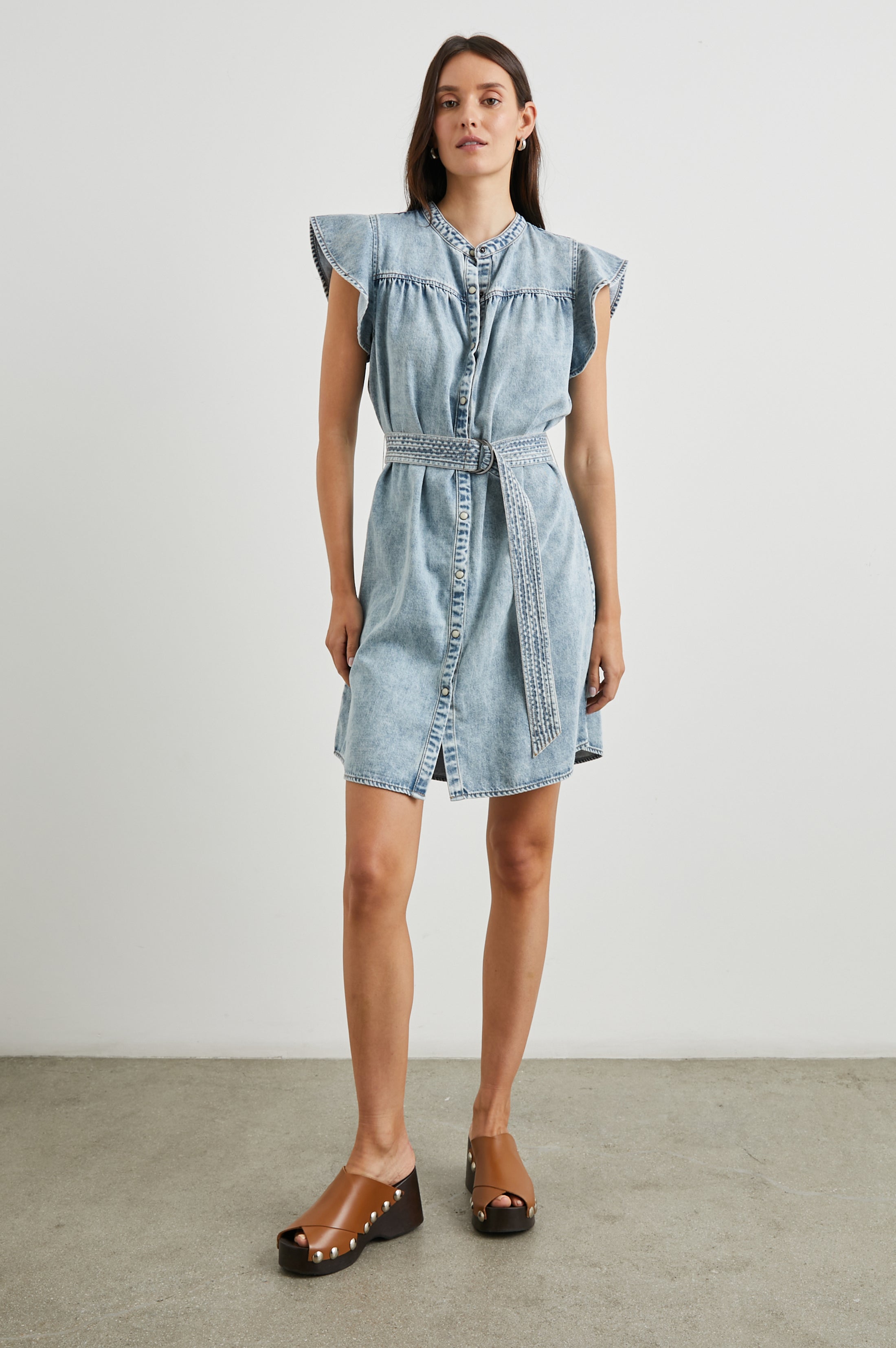 Dress to impress in this denim mini, made from ultra-soft Tencel and complete with a high neckline, belted waist, and feminine flutter sleeves.
