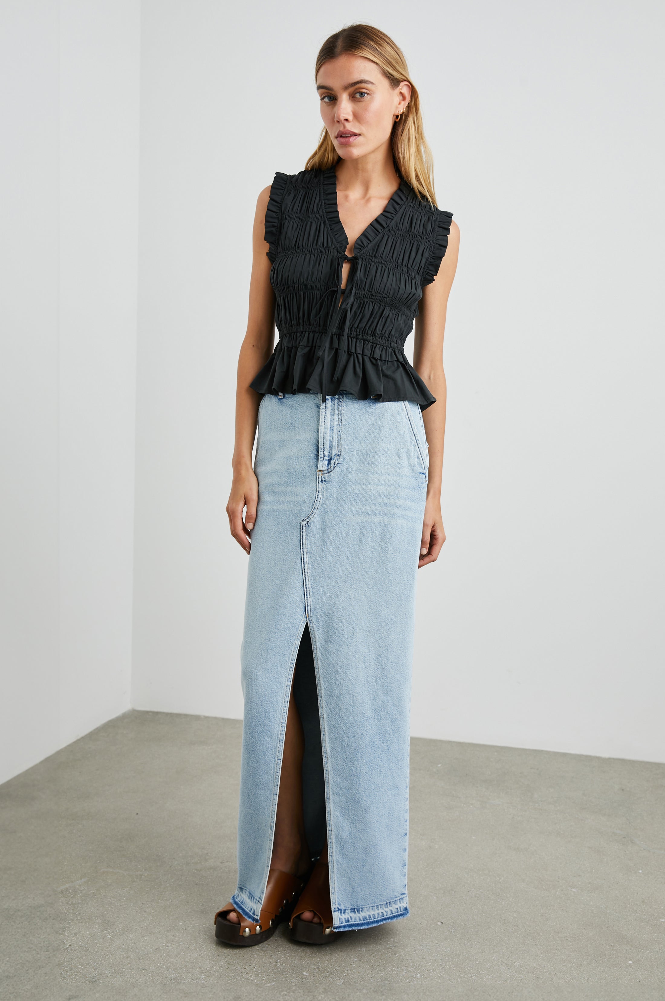 An essential in every wardrobe, Martine is made from heavy cotton poplin and features dainty feminine details like front ties and a ruffled bottom hem. She pairs well with skirts, shorts, and more and is guaranteed to cause compliments.