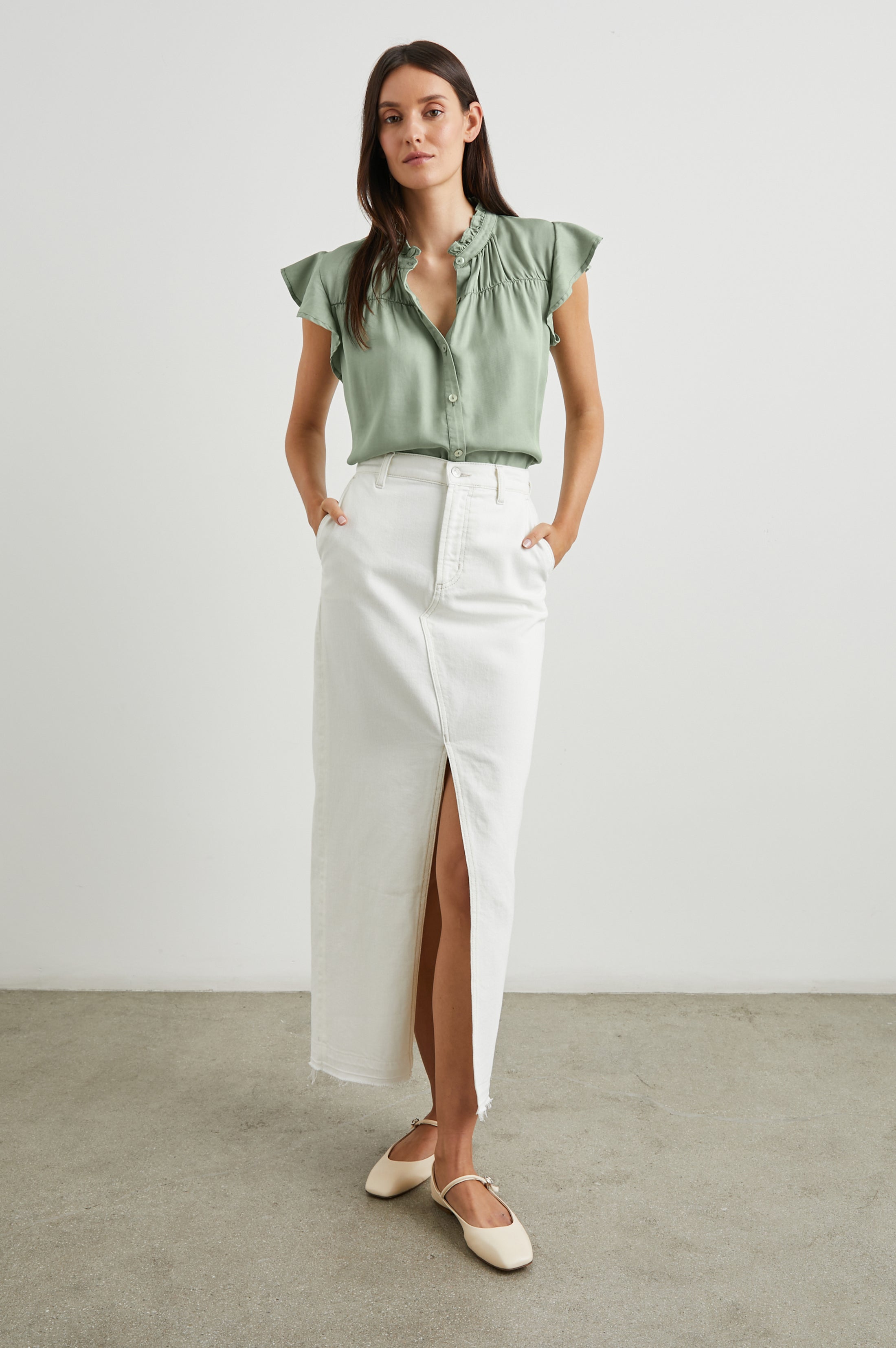 The Ruthie Top is an easy, everyday piece that's flattering, fun, and ultra feminine. Done in faded indigo, it's made of an ultra-lightweight Tencel with extreme softness. The banded collar, delicate shirring, and flouncy, cap sleeves contribute to its romantic look and feel.