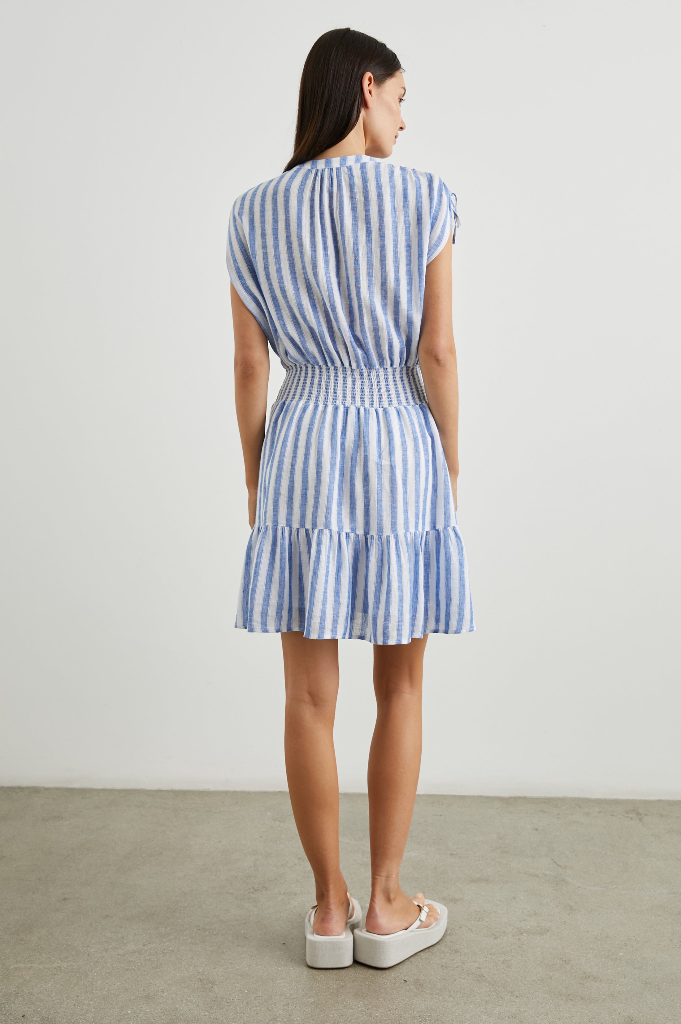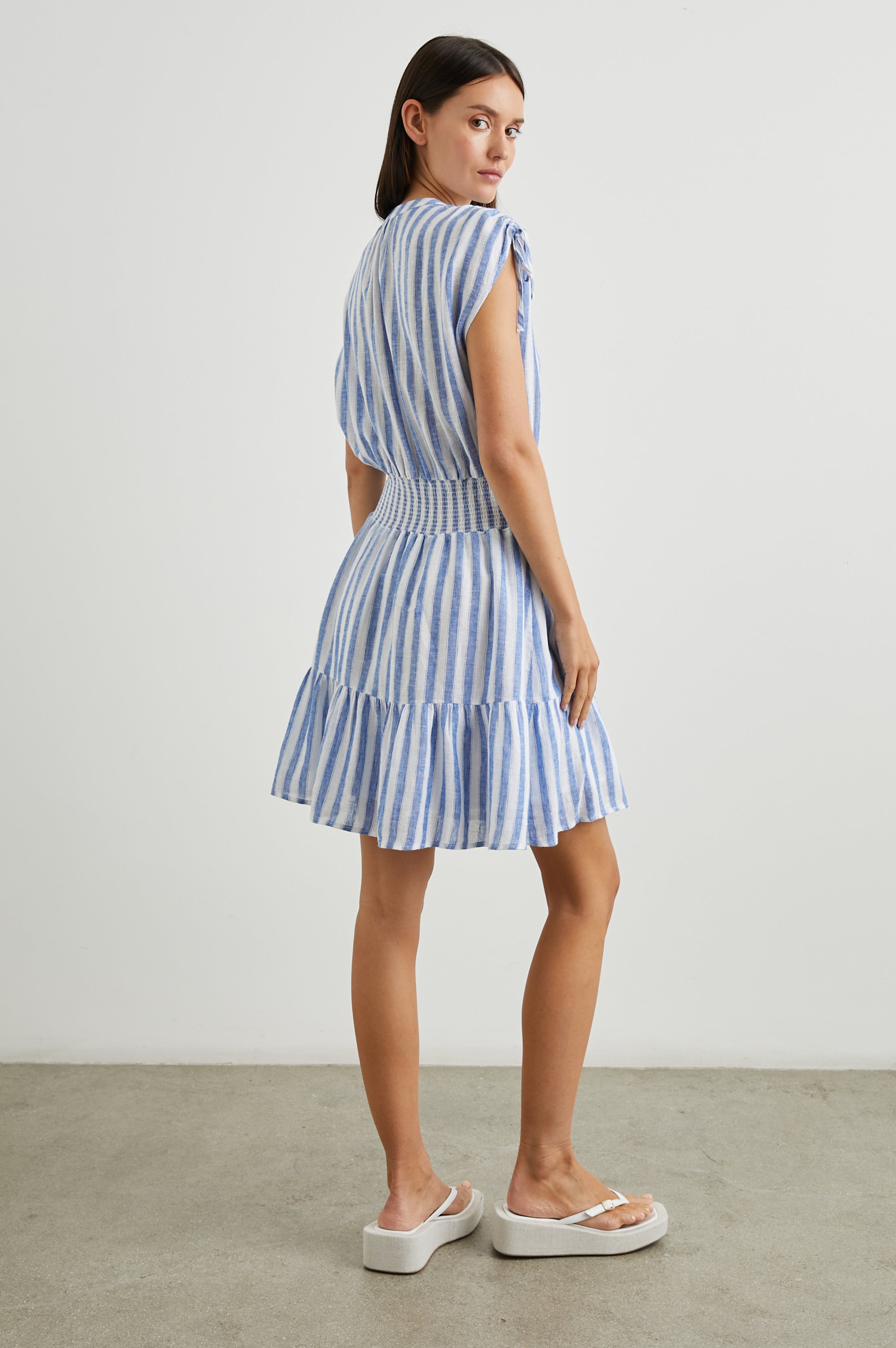 Refresh your sundress collection with Samina, a throw-on-and-go style cut from luxe linen. This dress is complete with flattering cinching at the waist and cut-off sleeves with adjustable drawstrings.