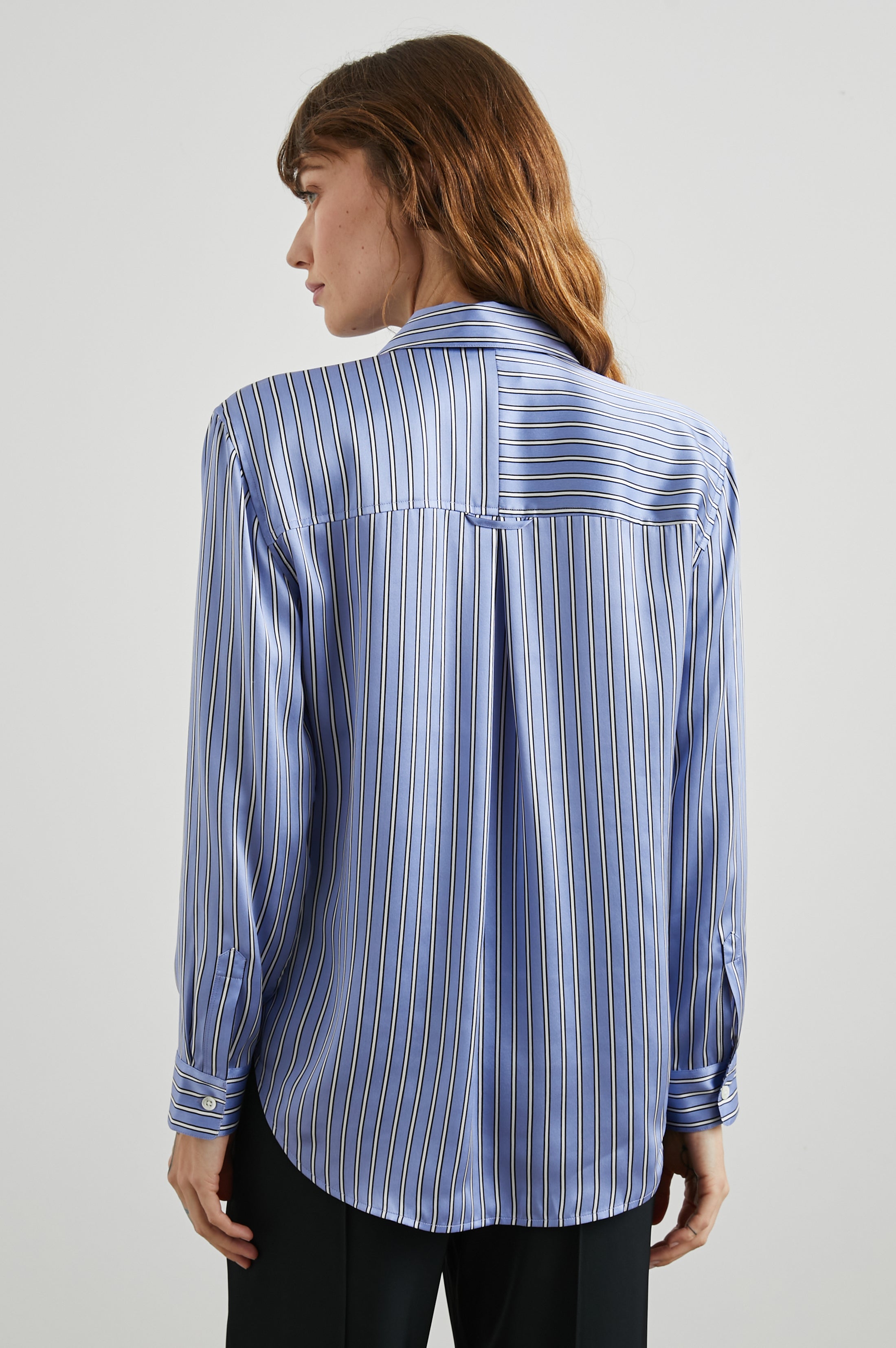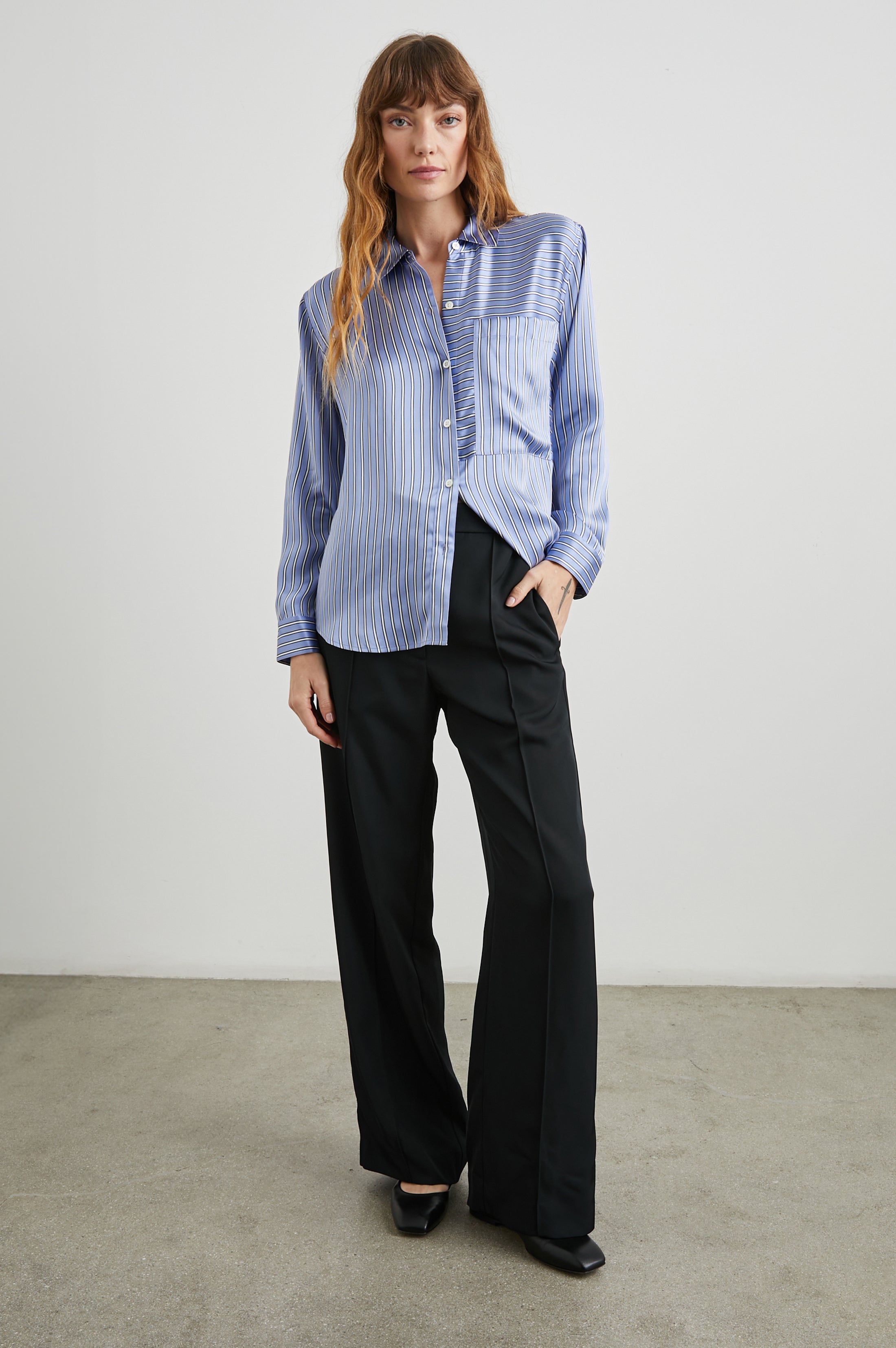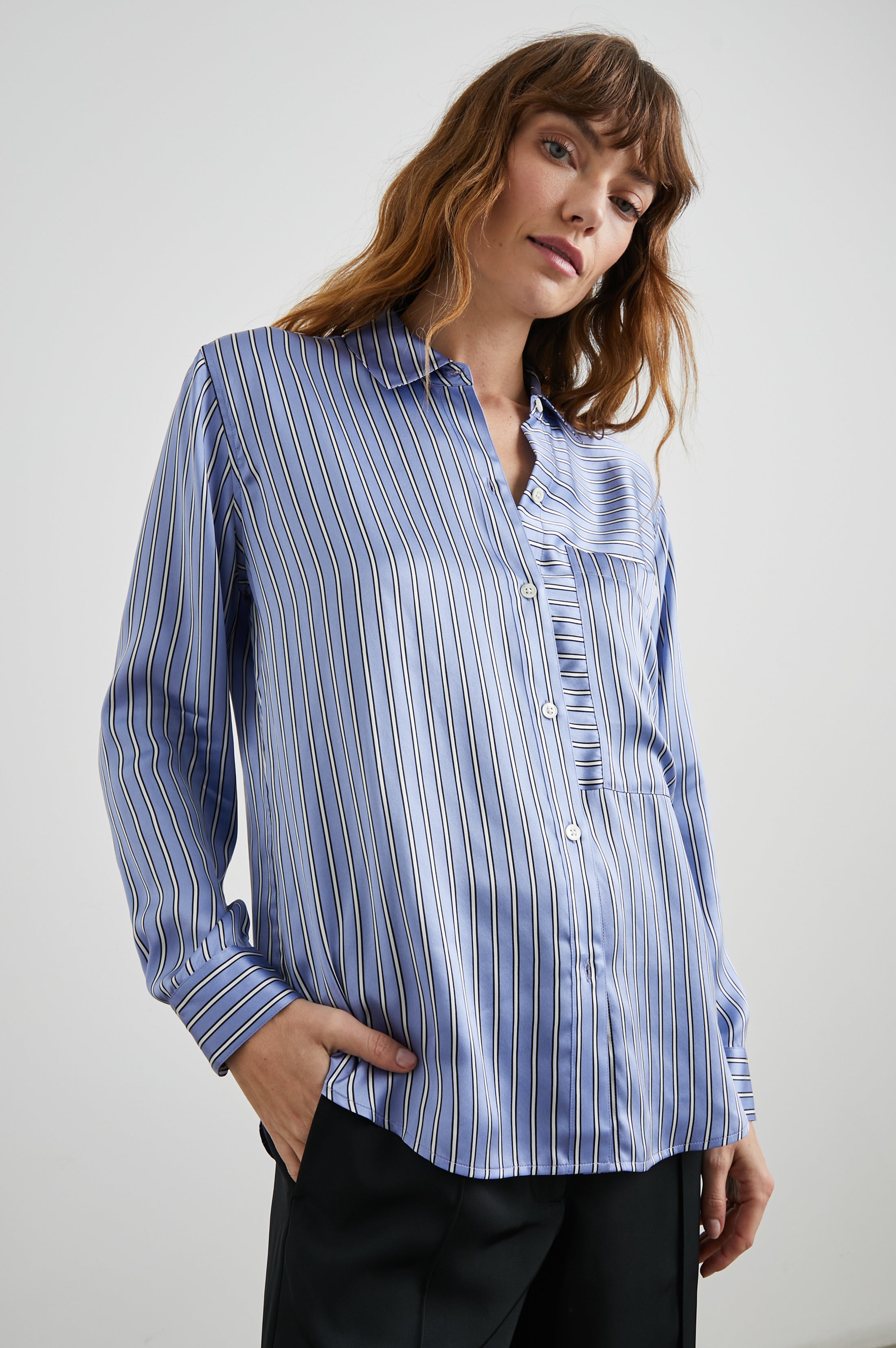 Look effortlessly refined and stylish in this unique button-down shirt featuring luxe fabric for a polished finish. Made from super smooth silk charmeuse this sky blue collared button-down shirt features bright white and navy mixed horizontal and vertical stripes, relaxed fit, oversized patch pocket at chest, and longer length.