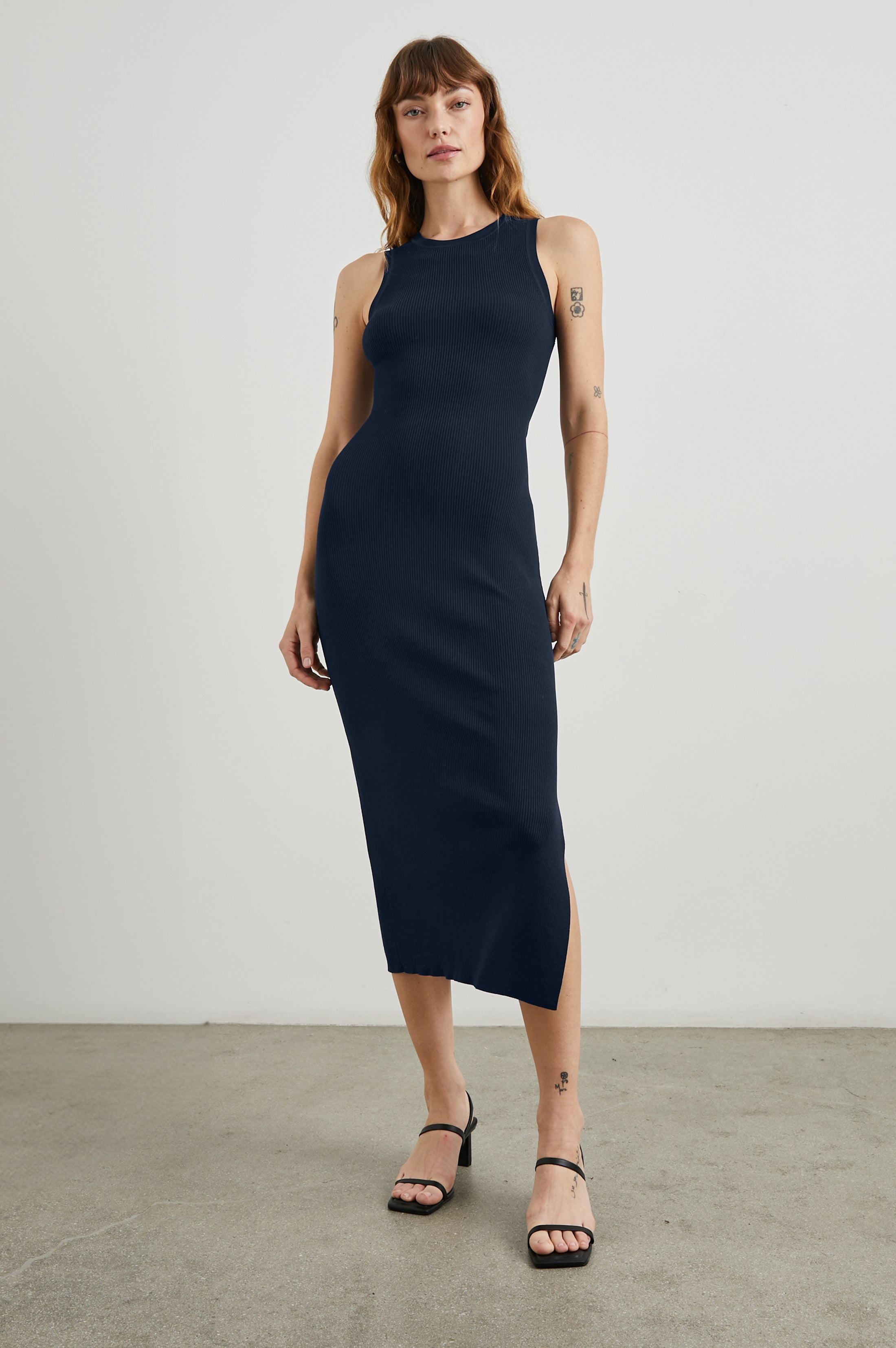 This flattering pullover dress is the perfect elevated take on comfortable, effortless dressing. A super soft, ribbed knit crewneck midi-length dress featuring a low cut-out detail at back.