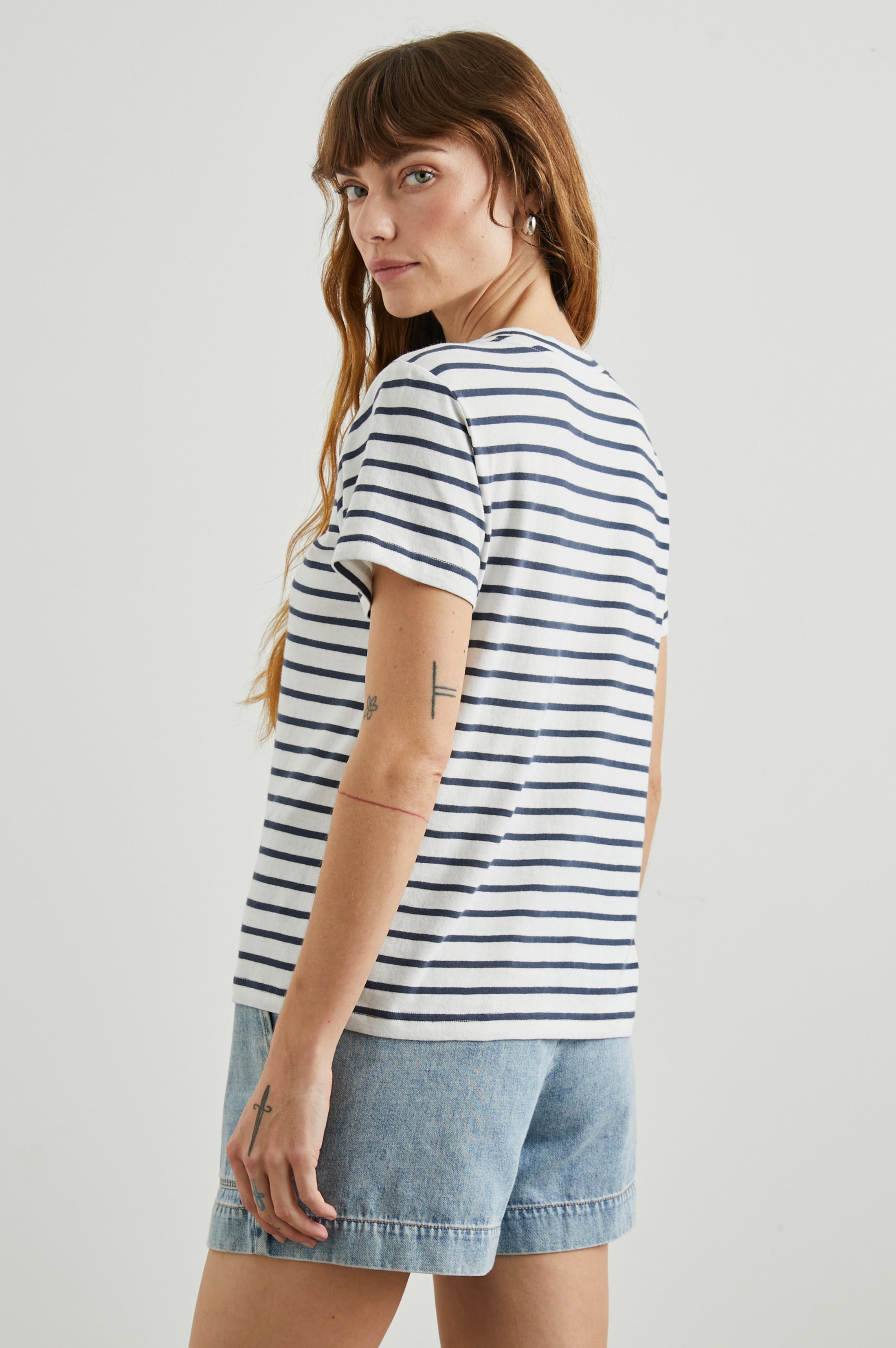 Your new go-to, this timeless white tee comes in a crewneck silhouette and features ivory and navy stripes. This super soft crewneck tee is made from brushed cotton, perfect for everyday comfort and breathability.