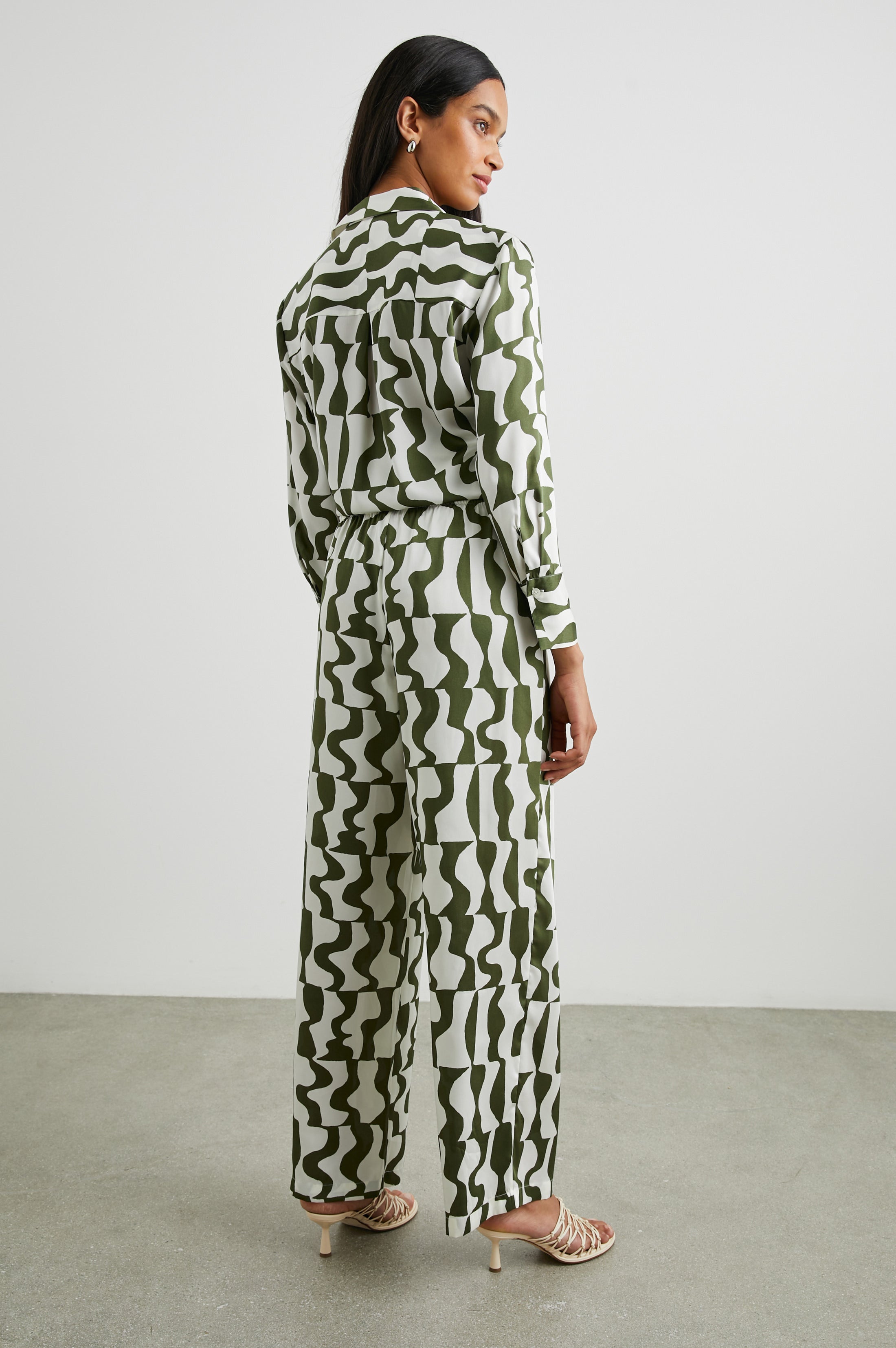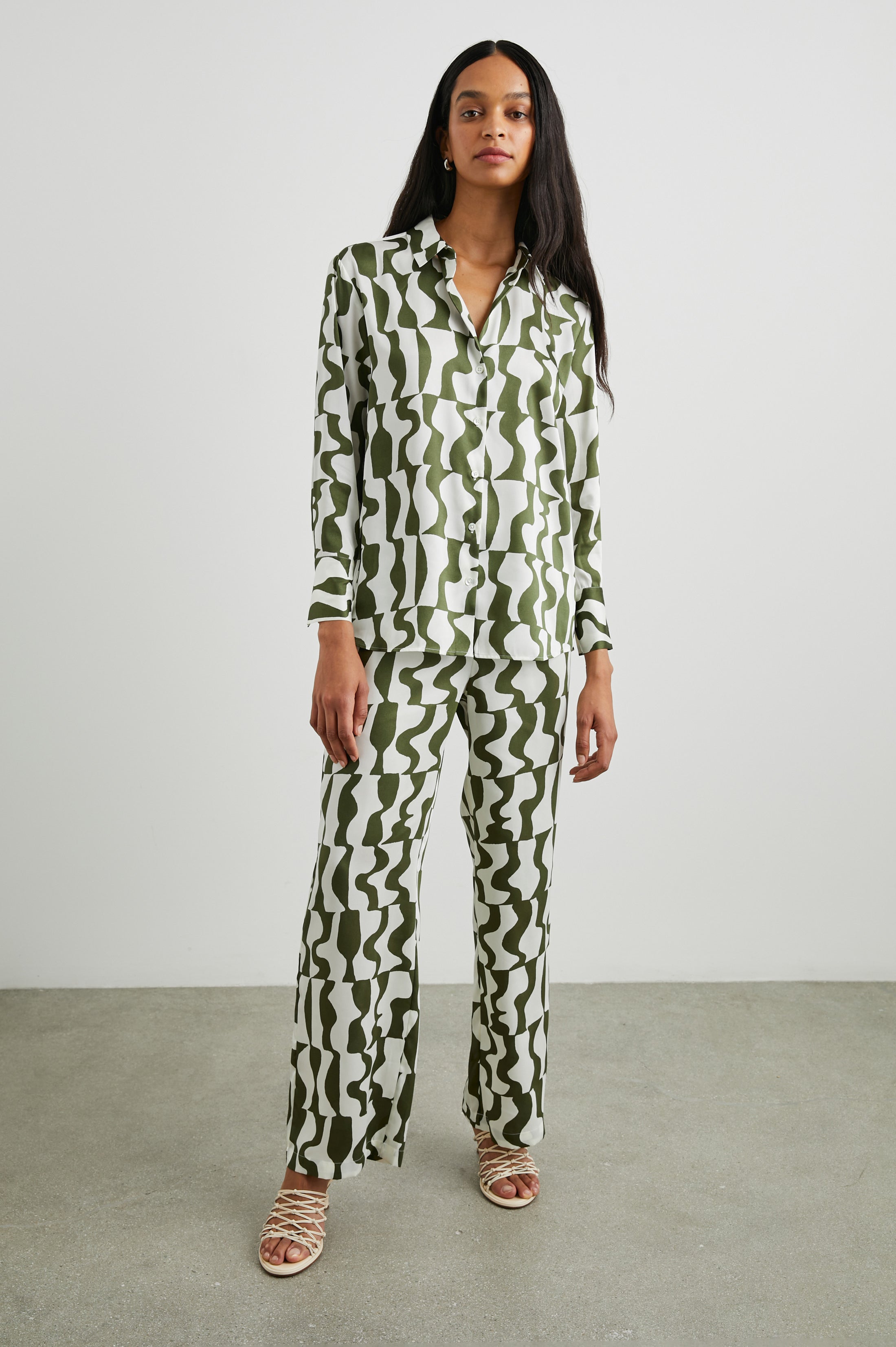 Crafted in shiny twill, this soft and sleek buttondown takes any outfit up a notch. Complete with an open neckline, relaxed body, and funky retro print.