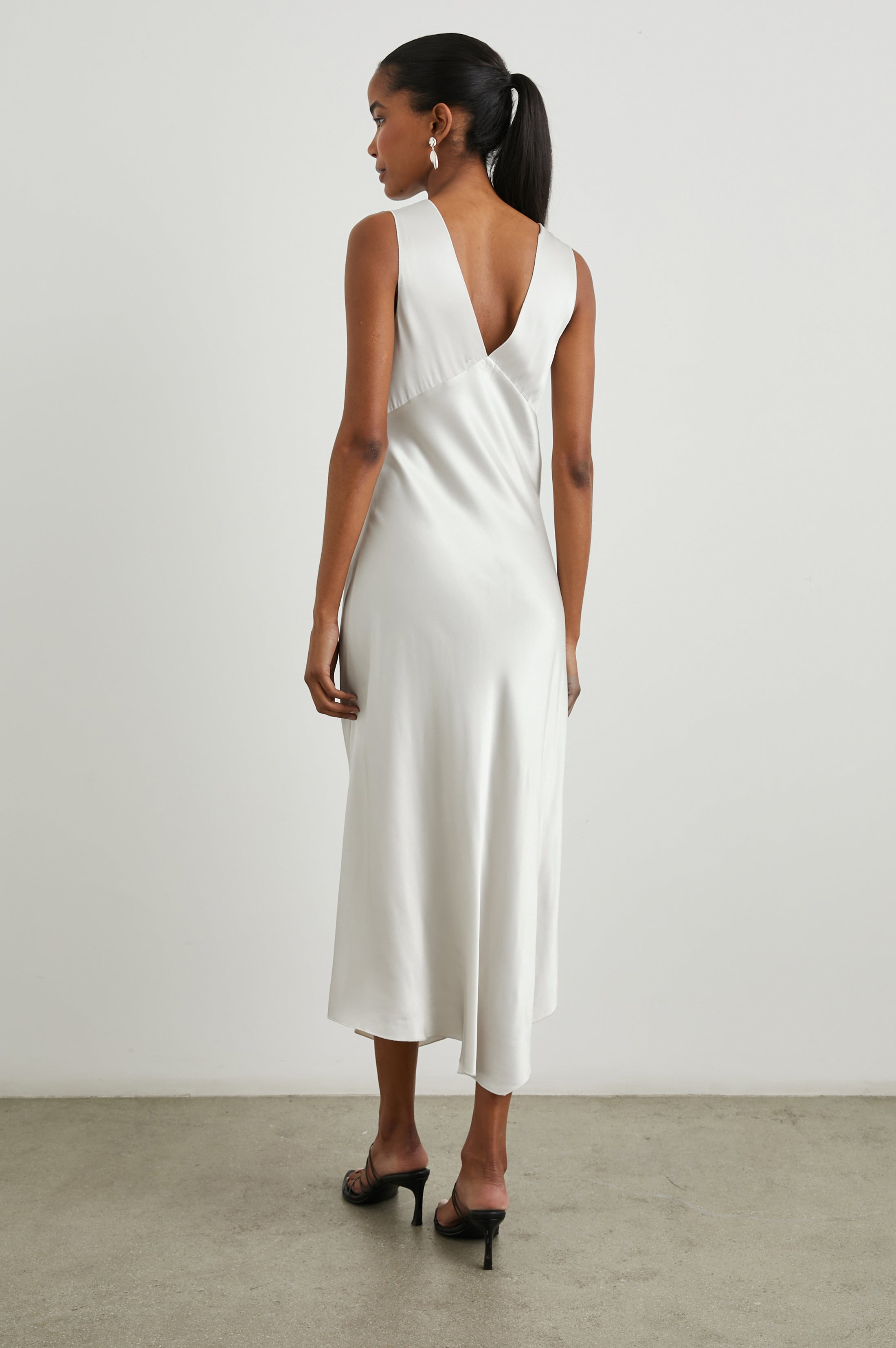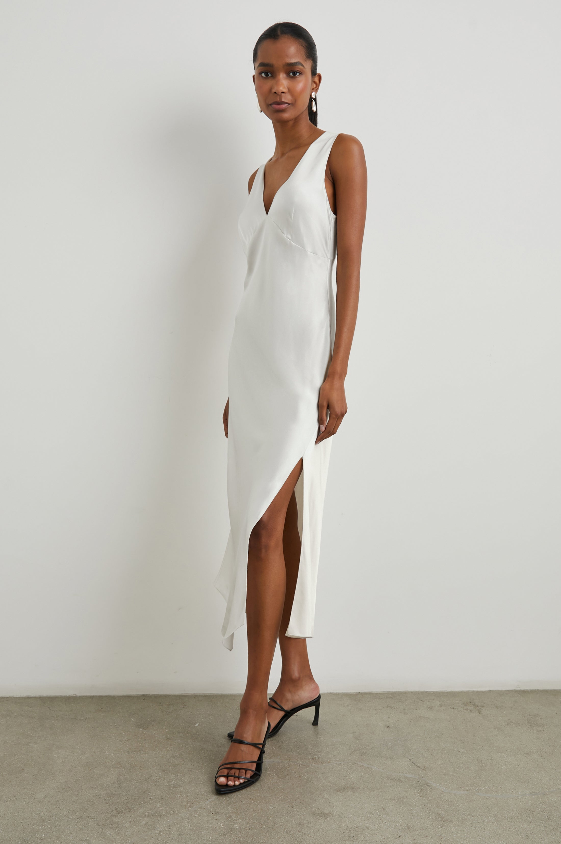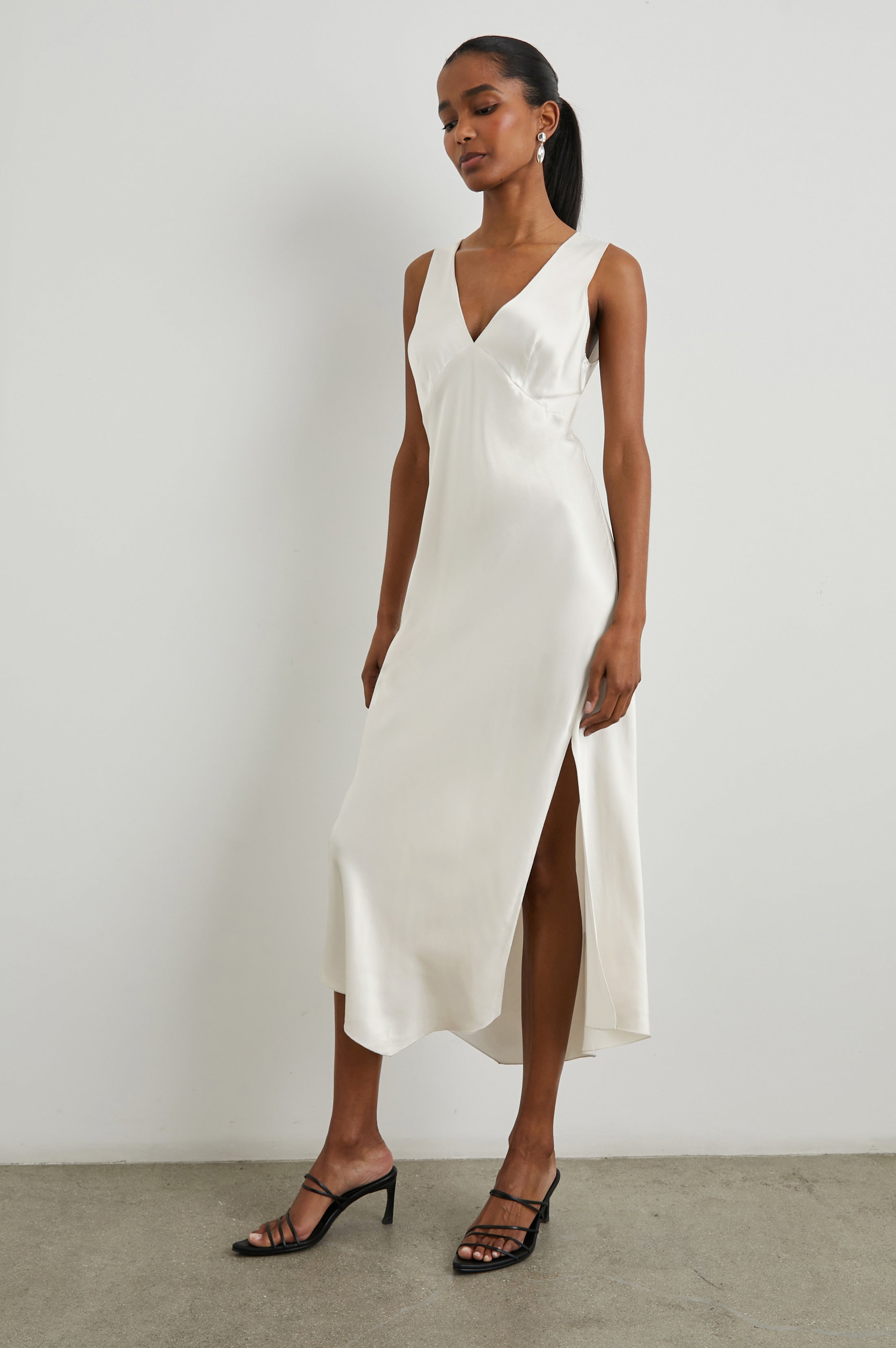 The Monique Dress has a modern slip dress silhouette made from satin back crepe. An asymmetrical hem, side slit, and delicate finish at the neckline are details that make it unique. On top of that, styling possibilities are aplenty: it can be worn on its own, over a tee, under a sweater.