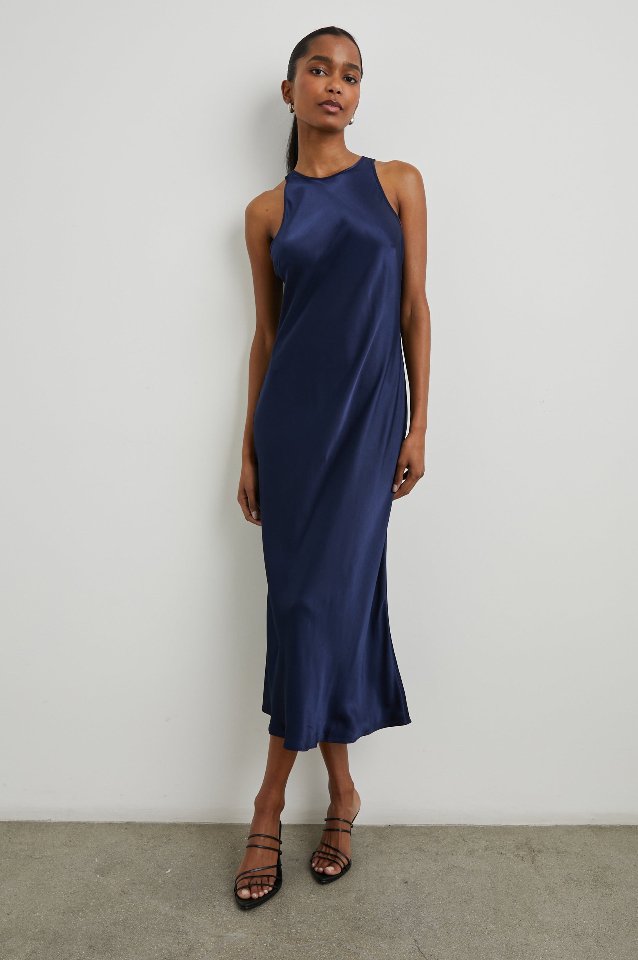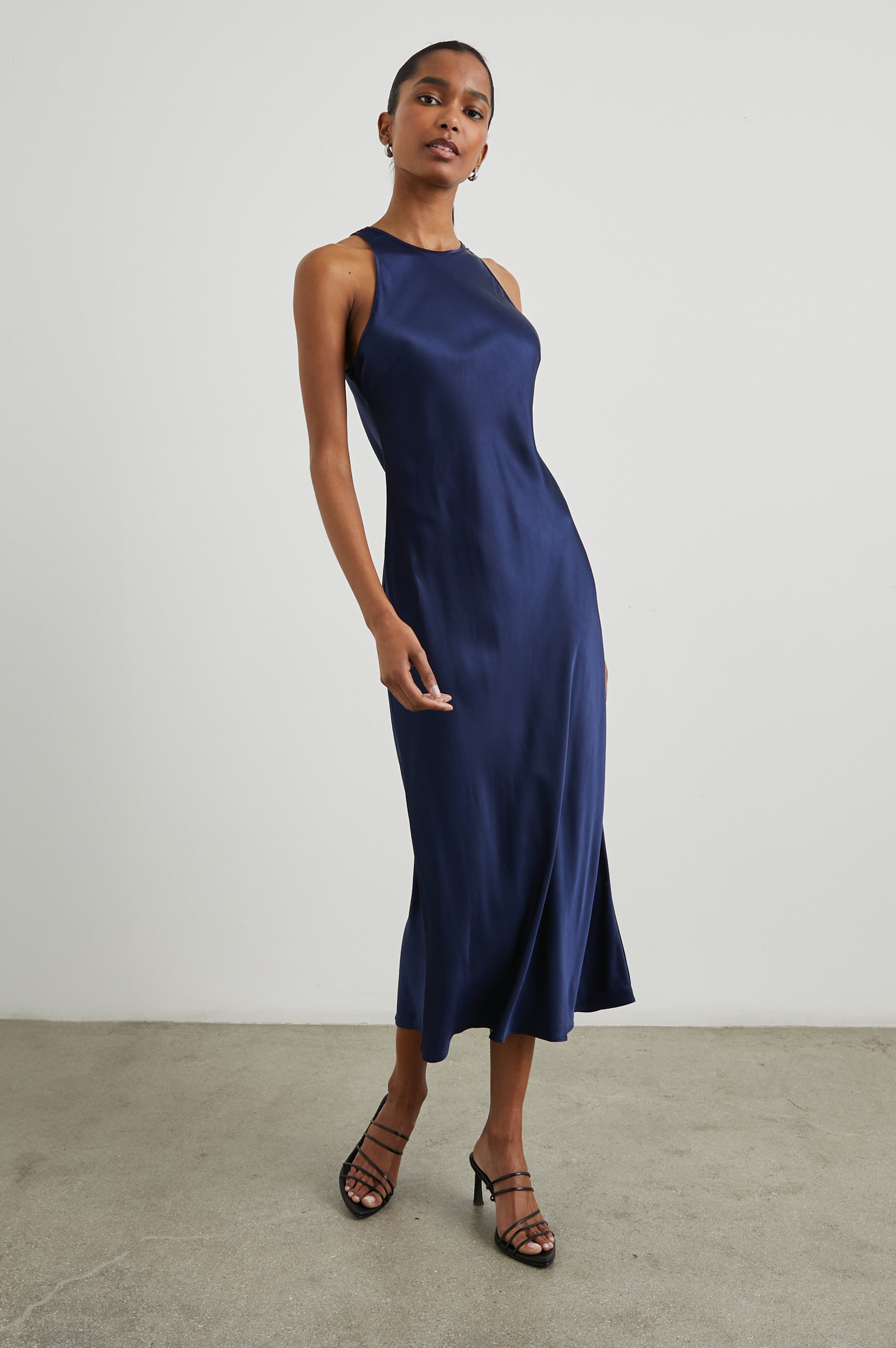 Make a statement with this sleeveless midi dress made from lightweight satin crepe. This dress features a unique lustrous look and an adjustable keyhole closure at back.