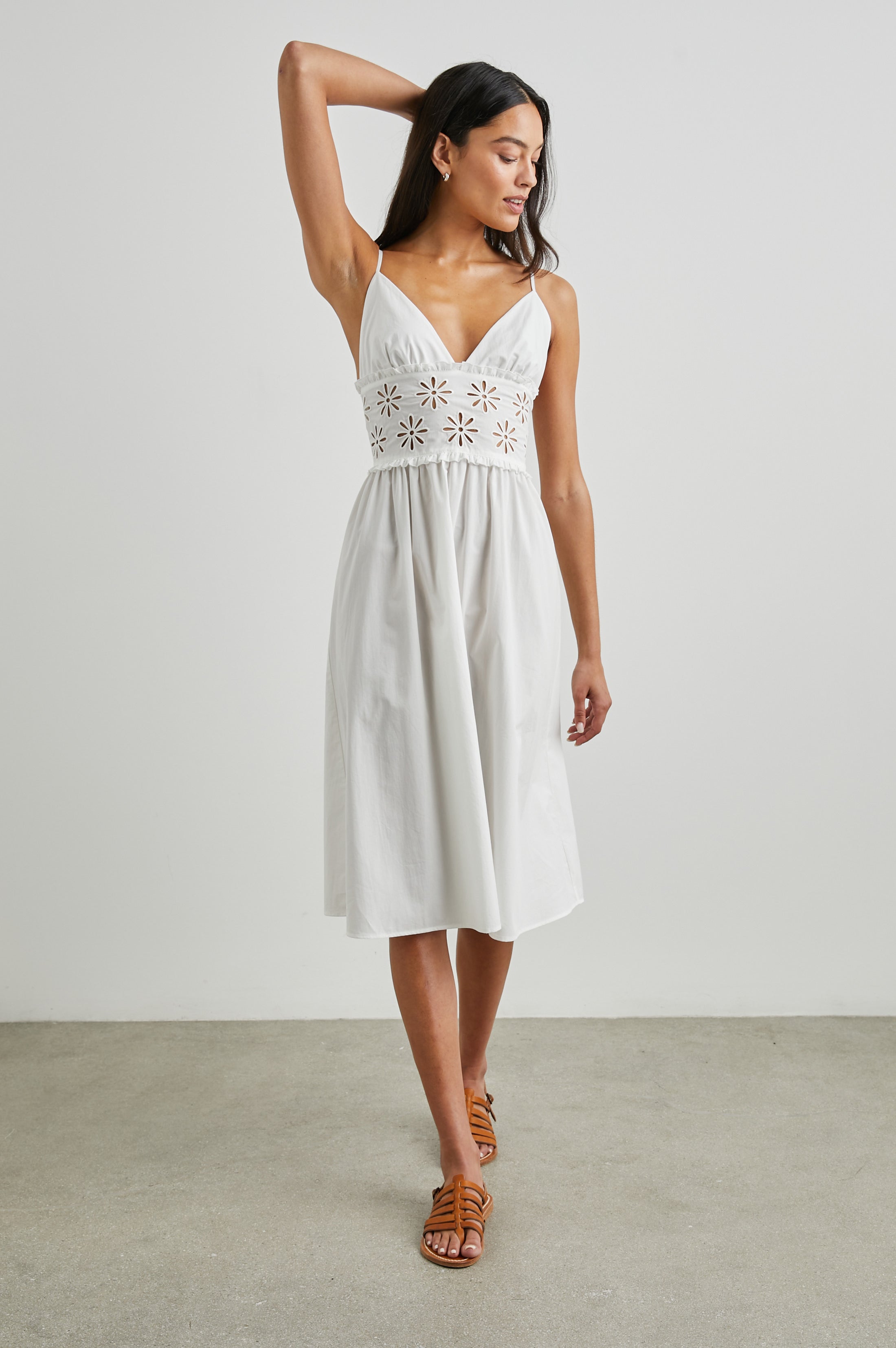 Say hello to sundress season. This cotton poplin beauty is sure to become your new favorite, featuring floral eyelet details, a flattering v-neckline, and flowy bodice.